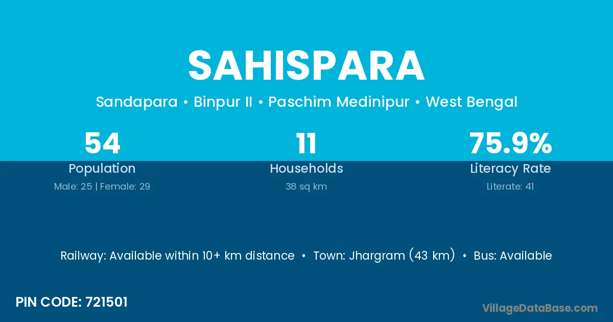 Jhargram (43 km) is the nearest town to Sahispara village for major economic activities and is located approximately 43 km away.