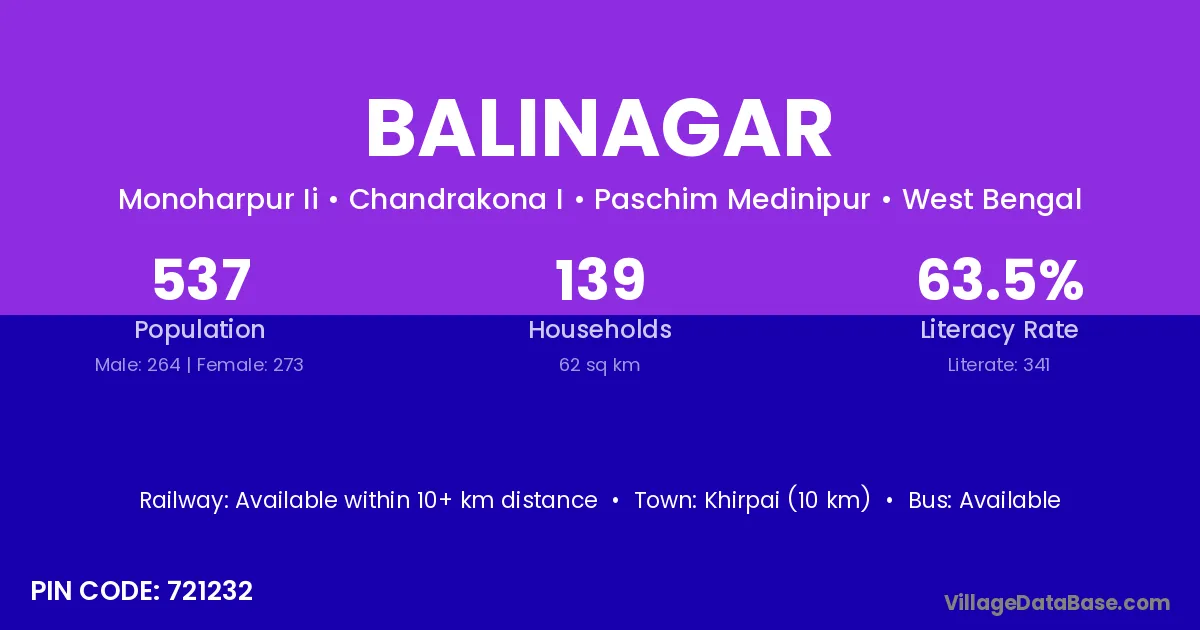 Khirpai (10 km) is the nearest town to Balinagar village for major economic activities and is located approximately 10 km away.