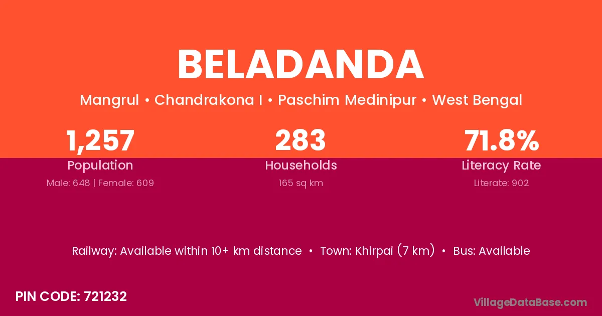 Khirpai (7 km) is the nearest town to Beladanda village for major economic activities and is located approximately 7 km away.