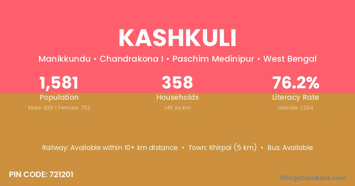Khirpai (5 km) is the nearest town to Kashkuli village for major economic activities and is located approximately 5 km away.
