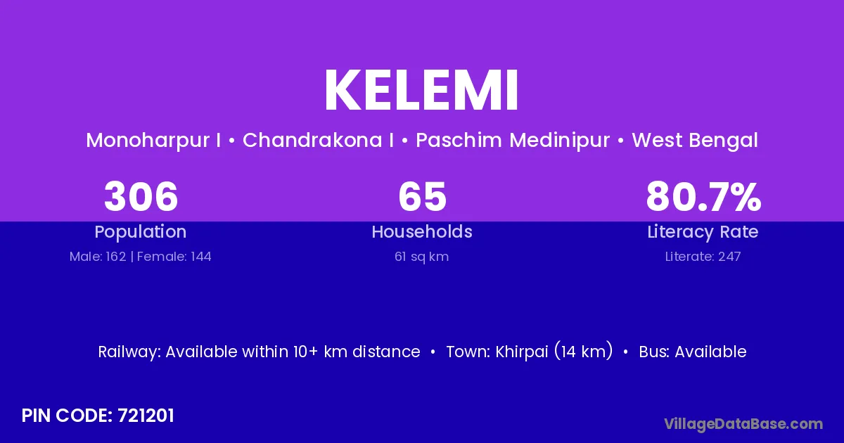 Khirpai (14 km) is the nearest town to Kelemi village for major economic activities and is located approximately 14 km away.