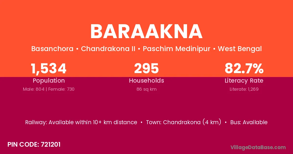Chandrakona (4 km) is the nearest town to Baraakna village for major economic activities and is located approximately 4 km away.