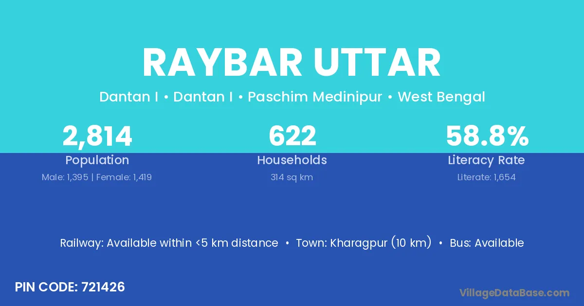 Kharagpur (10 km) is the nearest town to Raybar Uttar village for major economic activities and is located approximately 10 km away.