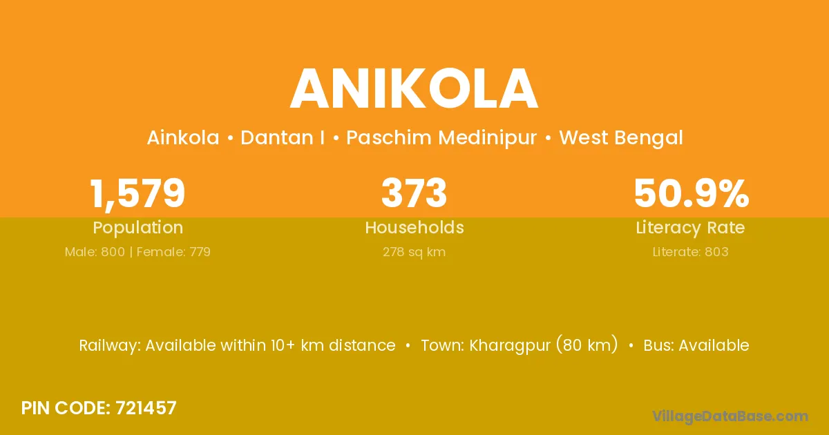 Kharagpur (80 km) is the nearest town to Anikola village for major economic activities and is located approximately 80 km away.