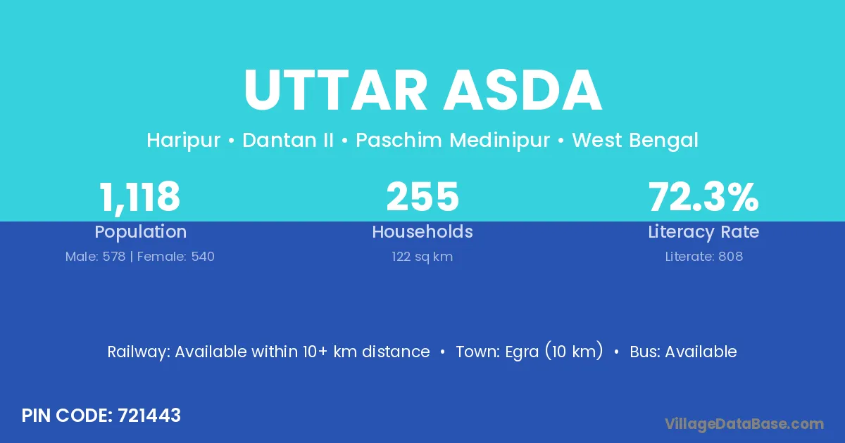 Egra (10 km) is the nearest town to Uttar Asda village for major economic activities and is located approximately 10 km away.