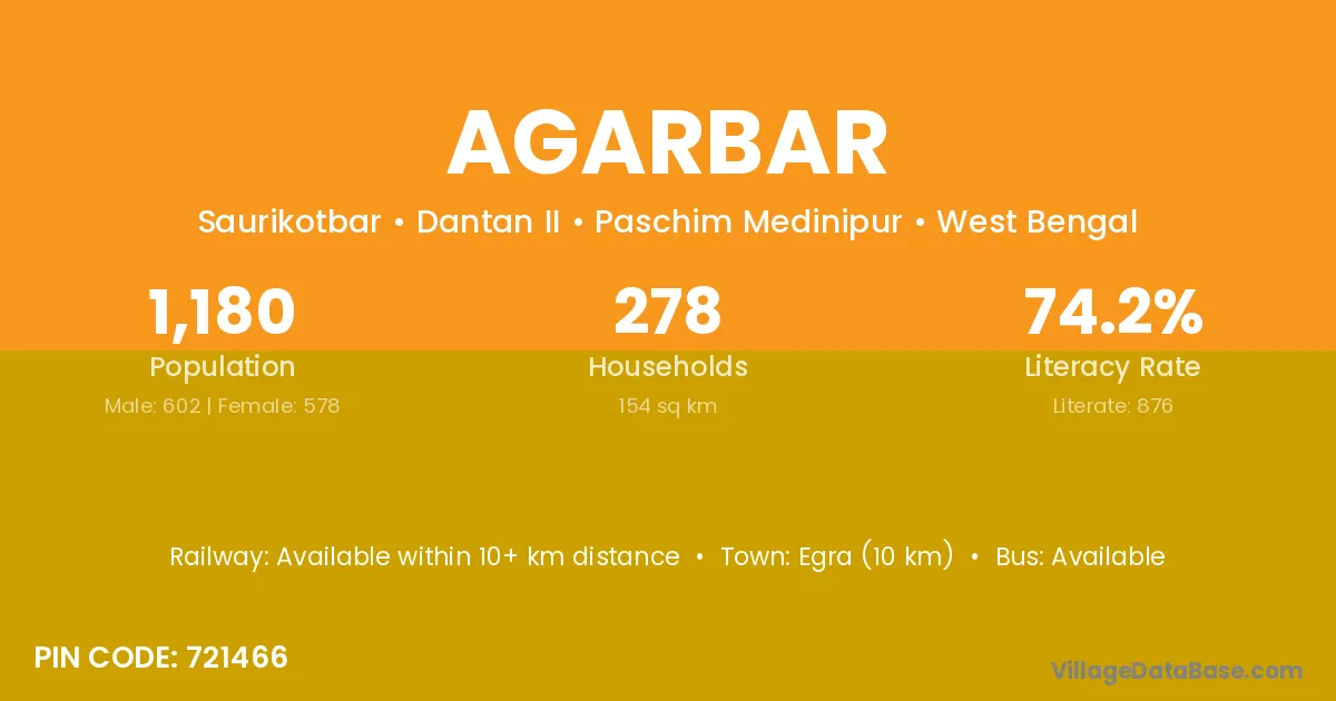 Egra (10 km) is the nearest town to Agarbar village for major economic activities and is located approximately 10 km away.