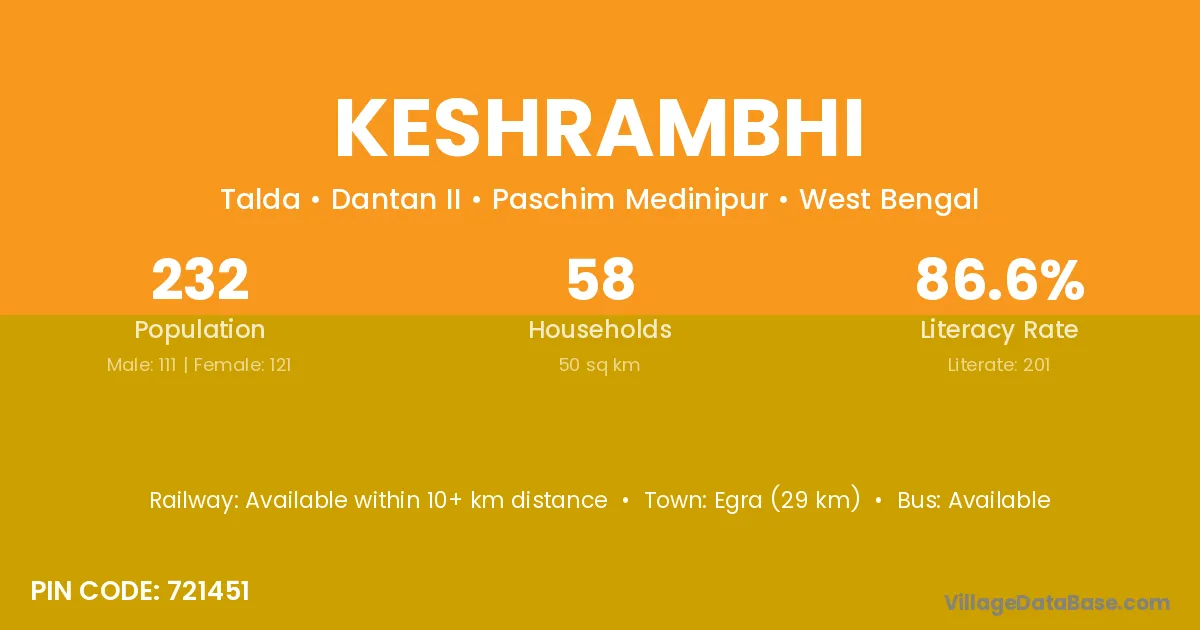 Egra (29 km) is the nearest town to Keshrambhi village for major economic activities and is located approximately 29 km away.