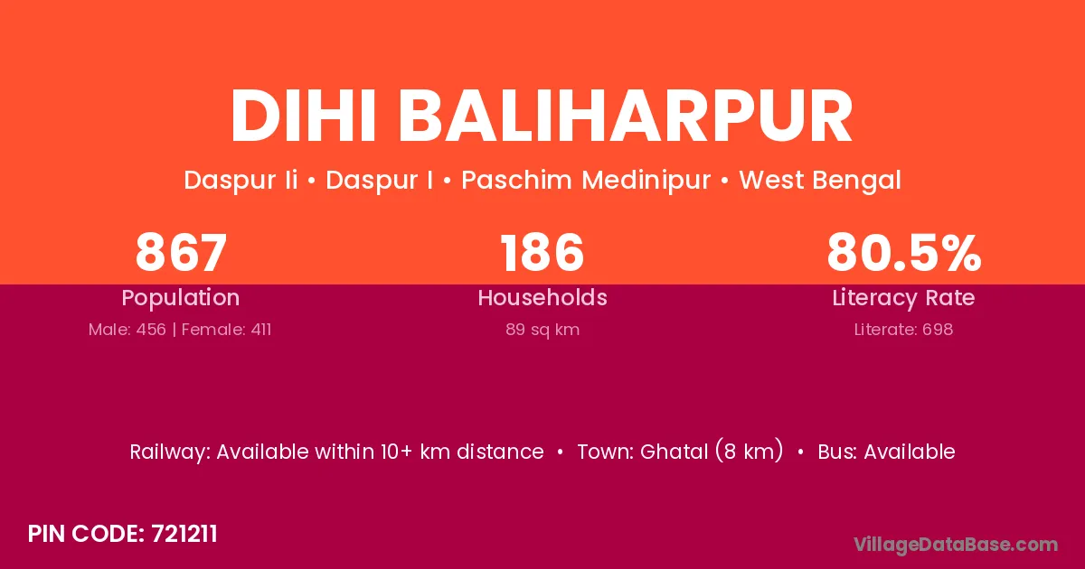 Ghatal (8 km) is the nearest town to Dihi Baliharpur village for major economic activities and is located approximately 8 km away.