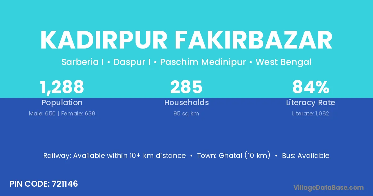 Ghatal (10 km) is the nearest town to Kadirpur Fakirbazar village for major economic activities and is located approximately 10 km away.