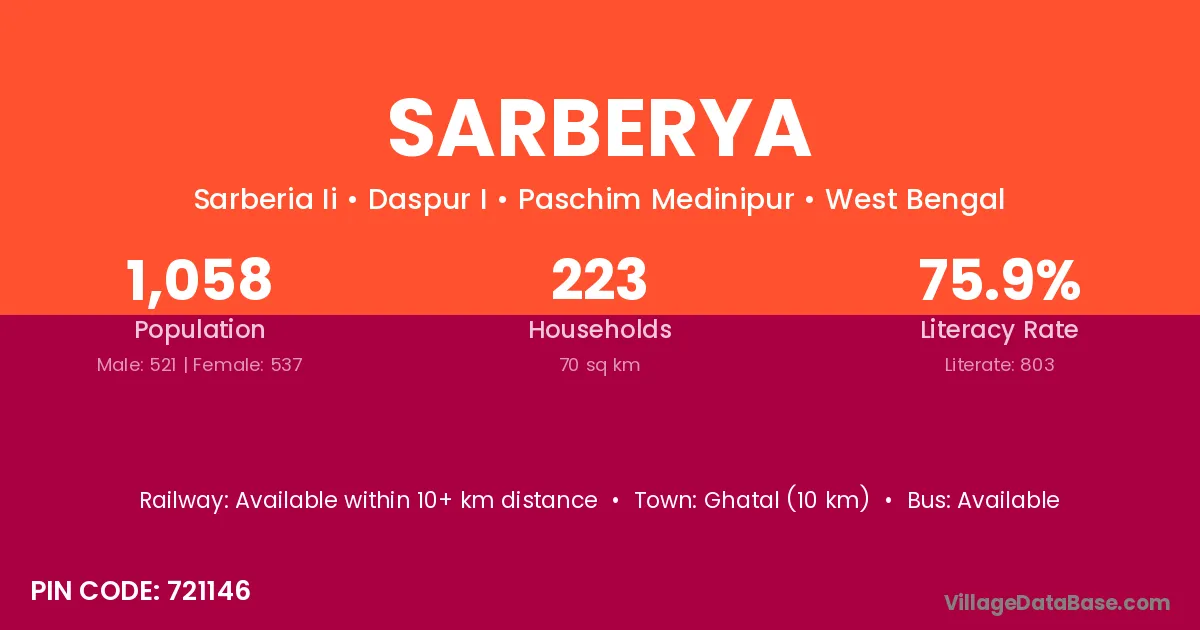 Ghatal (10 km) is the nearest town to Sarberya village for major economic activities and is located approximately 10 km away.