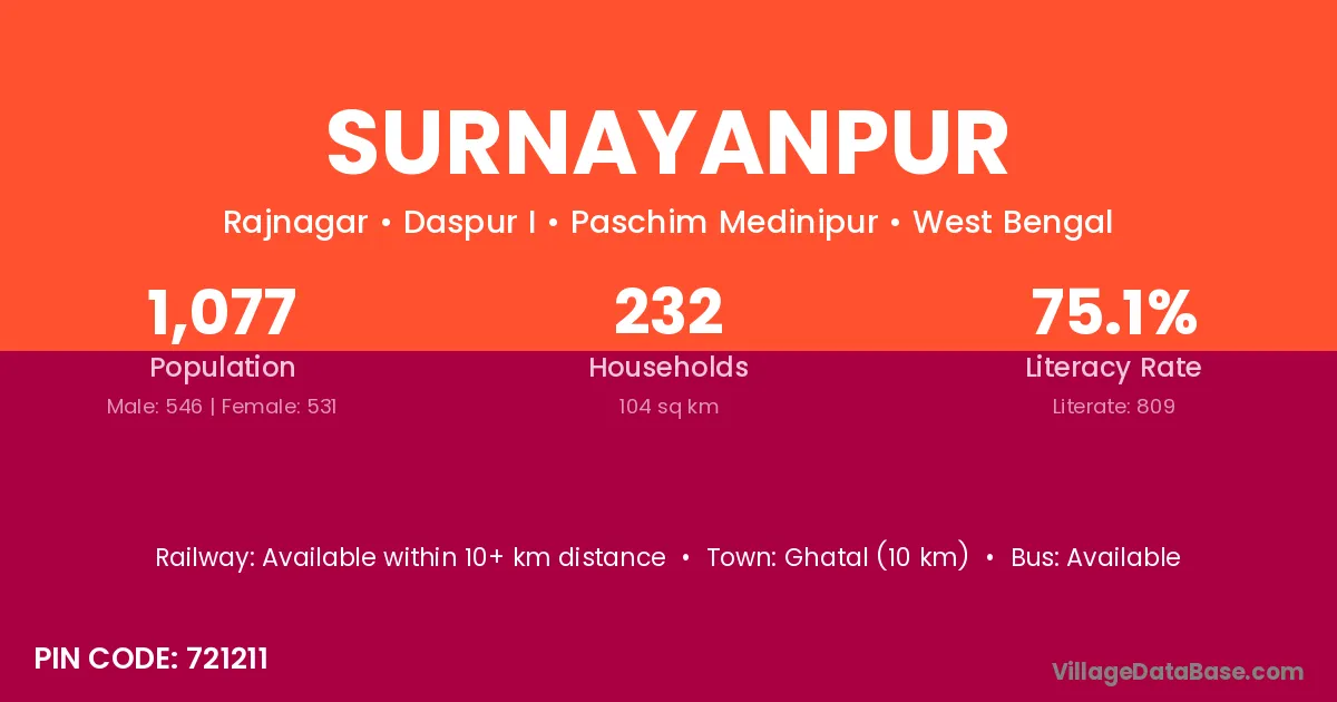 Ghatal (10 km) is the nearest town to Surnayanpur village for major economic activities and is located approximately 10 km away.