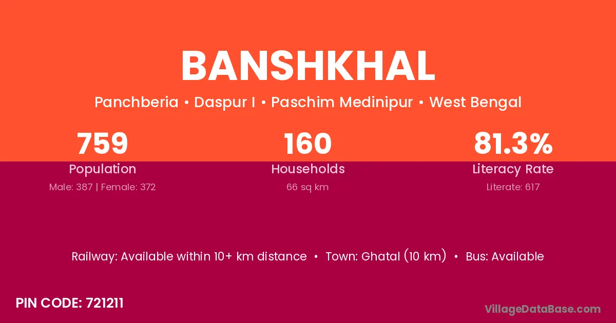 Ghatal (10 km) is the nearest town to Banshkhal village for major economic activities and is located approximately 10 km away.