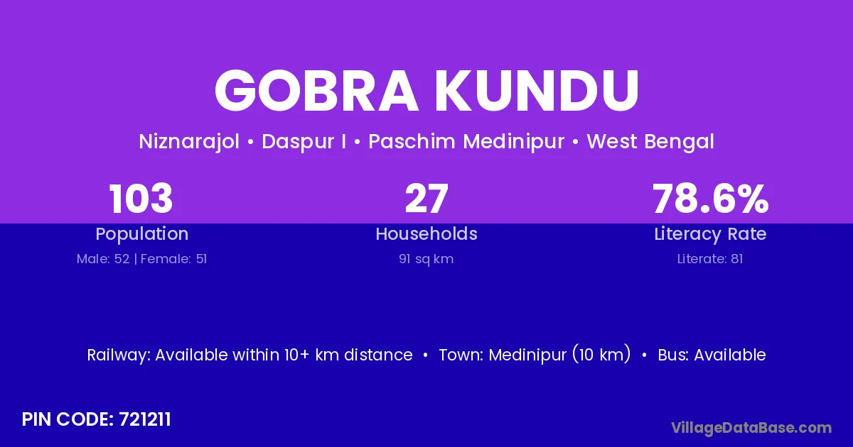 Medinipur (10 km) is the nearest town to Gobra Kundu village for major economic activities and is located approximately 10 km away.
