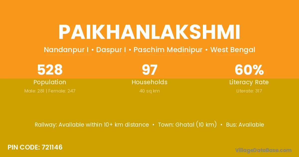 Ghatal (10 km) is the nearest town to Paikhanlakshmi village for major economic activities and is located approximately 10 km away.