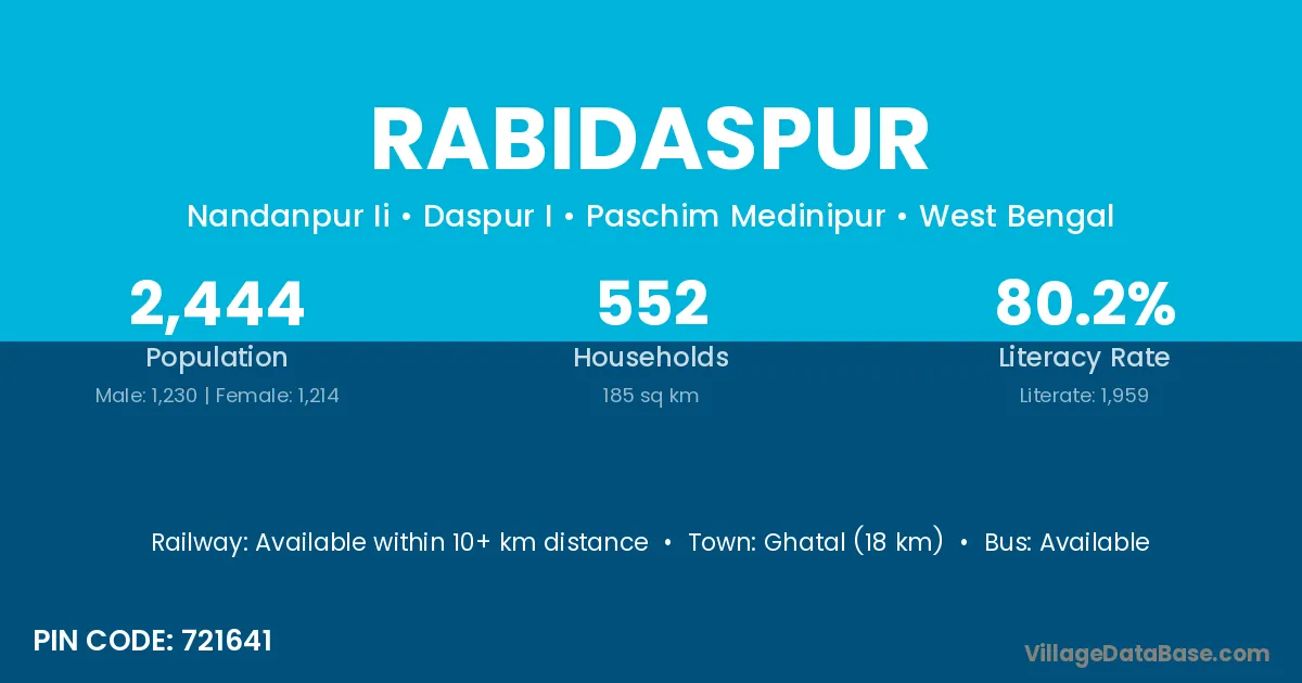 Ghatal (18 km) is the nearest town to Rabidaspur village for major economic activities and is located approximately 18 km away.