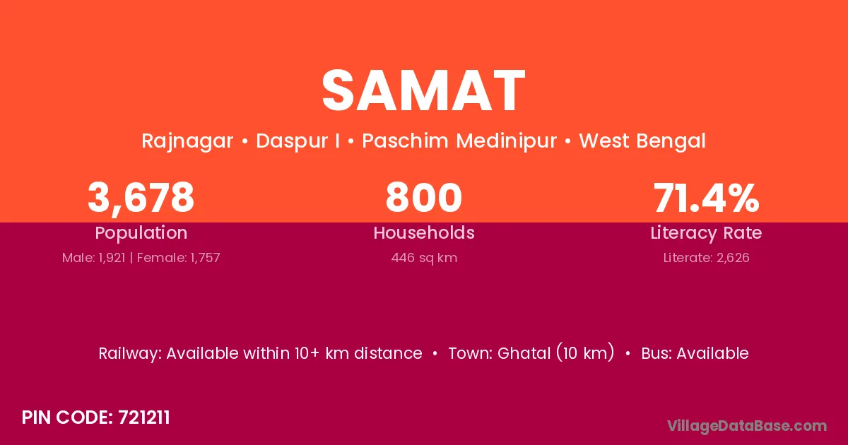 Ghatal (10 km) is the nearest town to Samat village for major economic activities and is located approximately 10 km away.