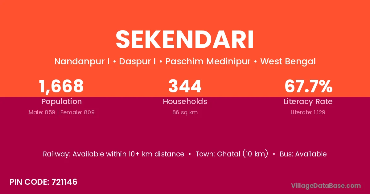 Ghatal (10 km) is the nearest town to Sekendari village for major economic activities and is located approximately 10 km away.