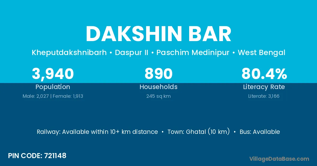 Ghatal (10 km) is the nearest town to Dakshin Bar village for major economic activities and is located approximately 10 km away.
