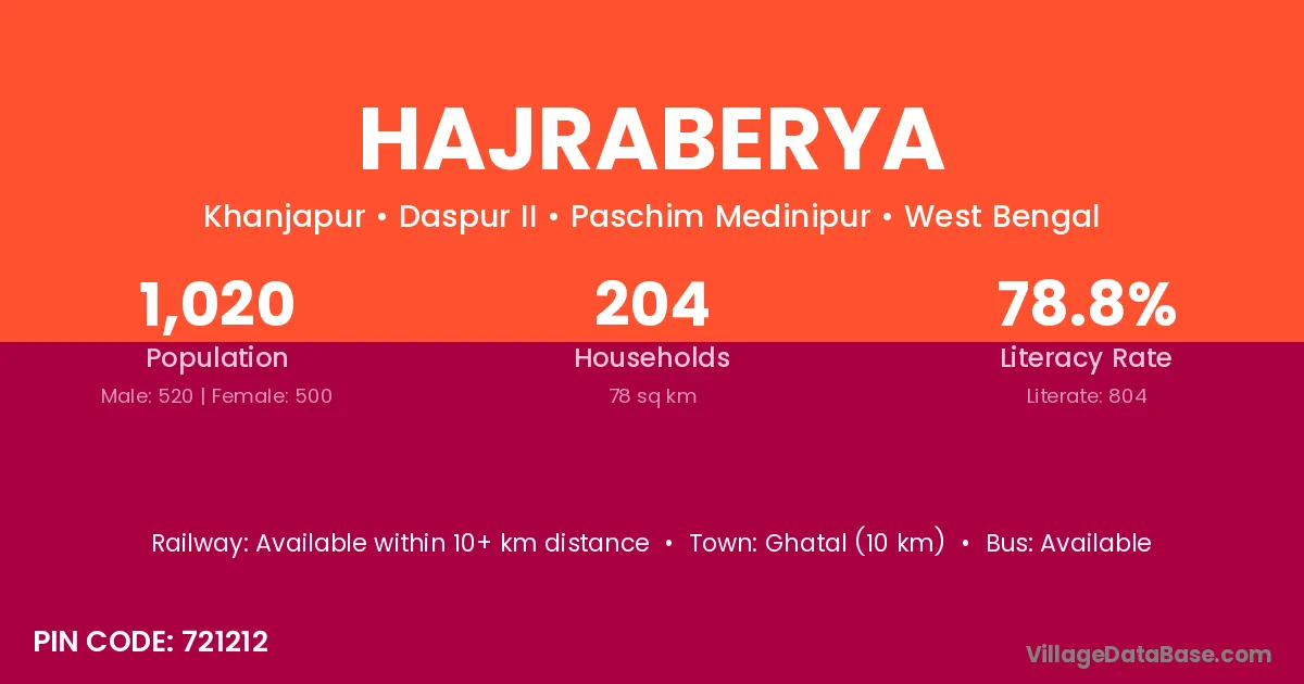 Ghatal (10 km) is the nearest town to Hajraberya village for major economic activities and is located approximately 10 km away.