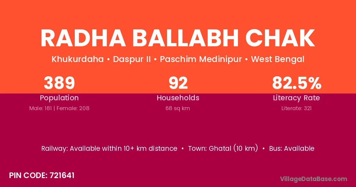 Ghatal (10 km) is the nearest town to Radha Ballabh Chak village for major economic activities and is located approximately 10 km away.