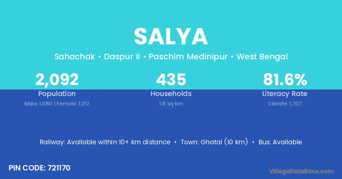 Ghatal (10 km) is the nearest town to Salya village for major economic activities and is located approximately 10 km away.
