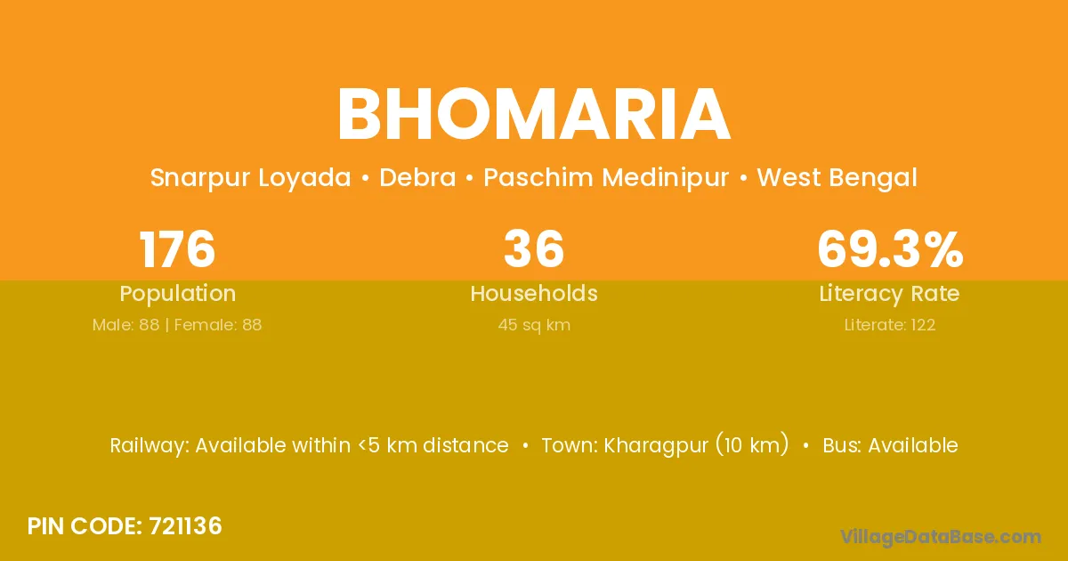 Kharagpur (10 km) is the nearest town to Bhomaria village for major economic activities and is located approximately 10 km away.