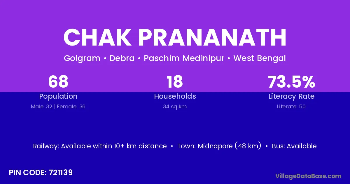 Midnapore (48 km) is the nearest town to Chak Prananath village for major economic activities and is located approximately 48 km away.