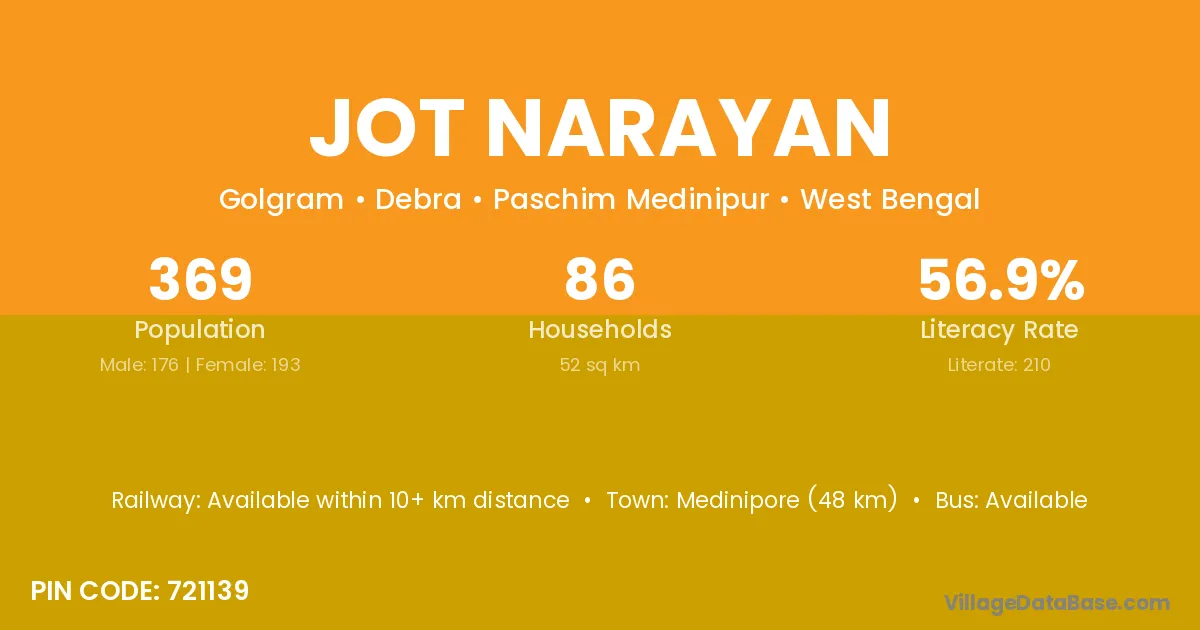 Medinipore (48 km) is the nearest town to Jot Narayan village for major economic activities and is located approximately 48 km away.