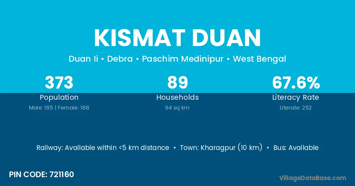 Kismat Duan village is located in the Debra Subdivision of the Paschim Medinipur district in West Bengal .
