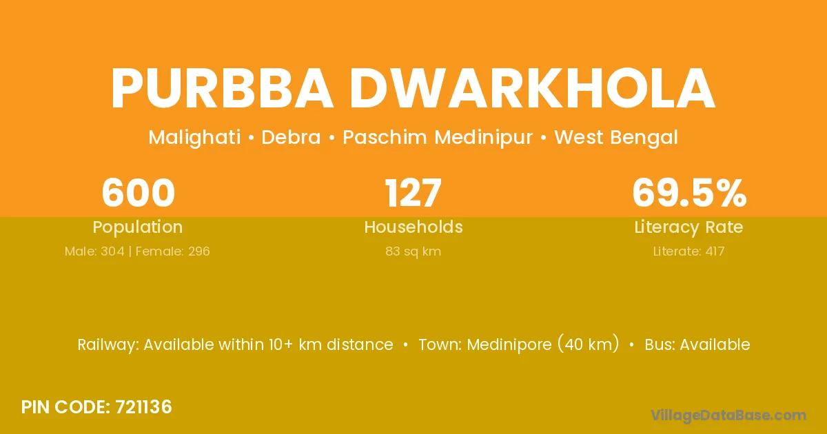 Medinipore (40 km) is the nearest town to Purbba Dwarkhola village for major economic activities and is located approximately 40 km away.
