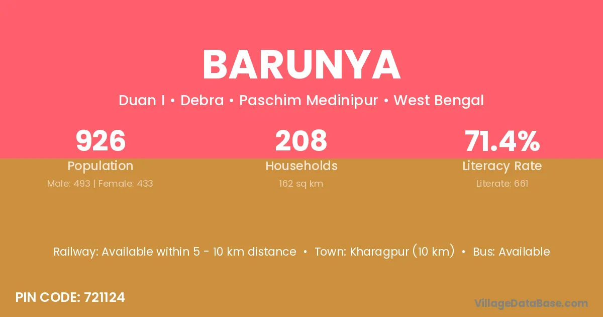 Kharagpur (10 km) is the nearest town to Barunya village for major economic activities and is located approximately 10 km away.