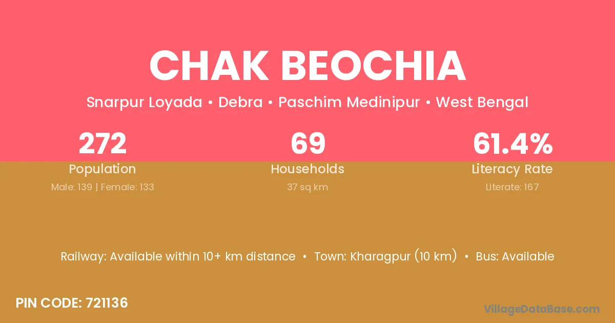 Kharagpur (10 km) is the nearest town to Chak Beochia village for major economic activities and is located approximately 10 km away.