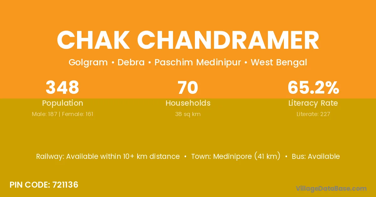 Medinipore (41 km) is the nearest town to Chak Chandramer village for major economic activities and is located approximately 41 km away.