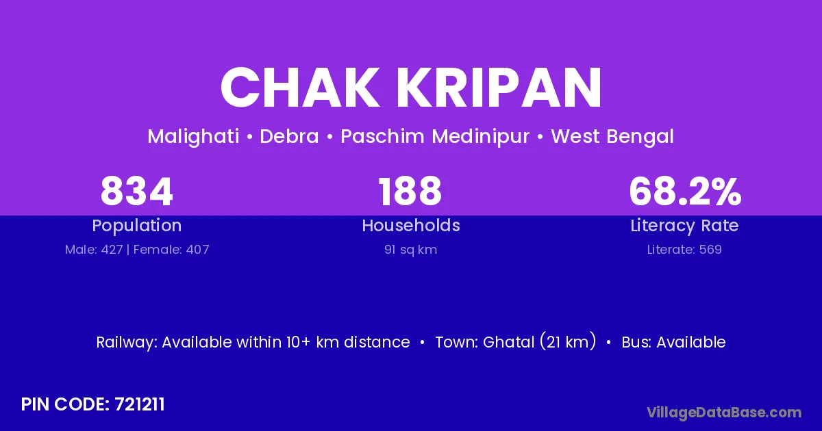 Ghatal (21 km) is the nearest town to Chak Kripan village for major economic activities and is located approximately 21 km away.