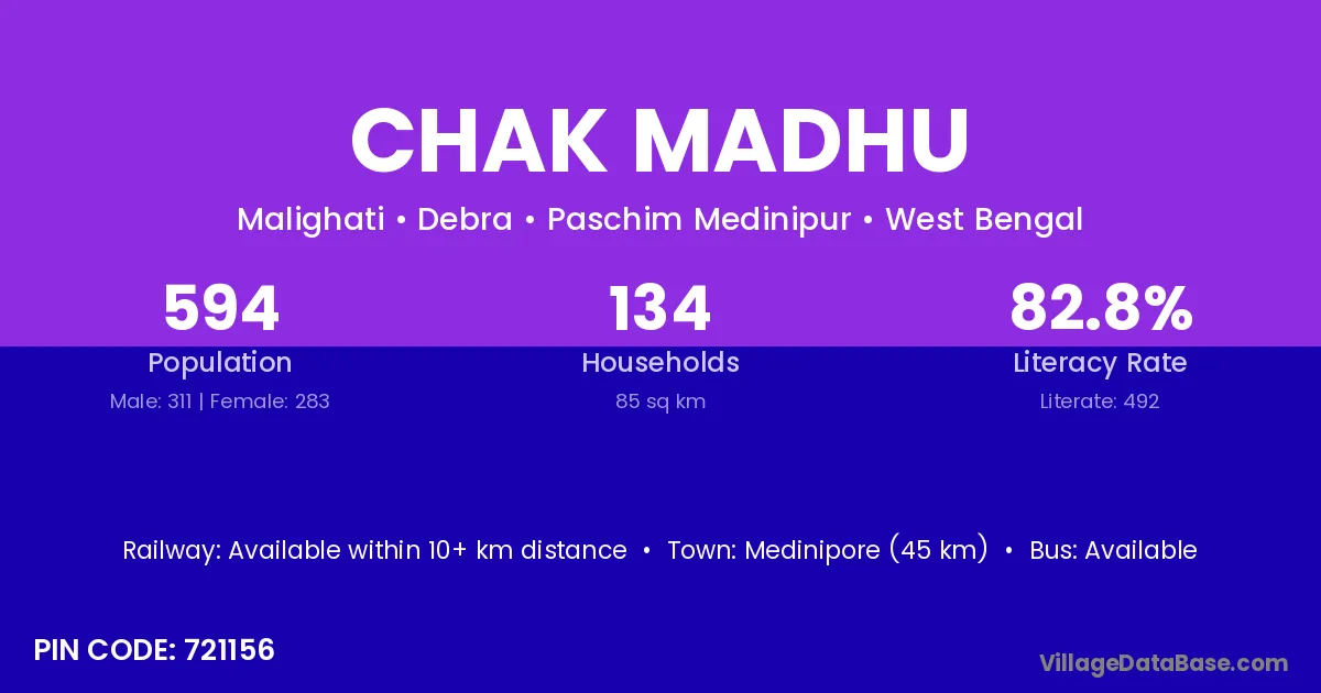 Medinipore (45 km) is the nearest town to Chak Madhu village for major economic activities and is located approximately 45 km away.