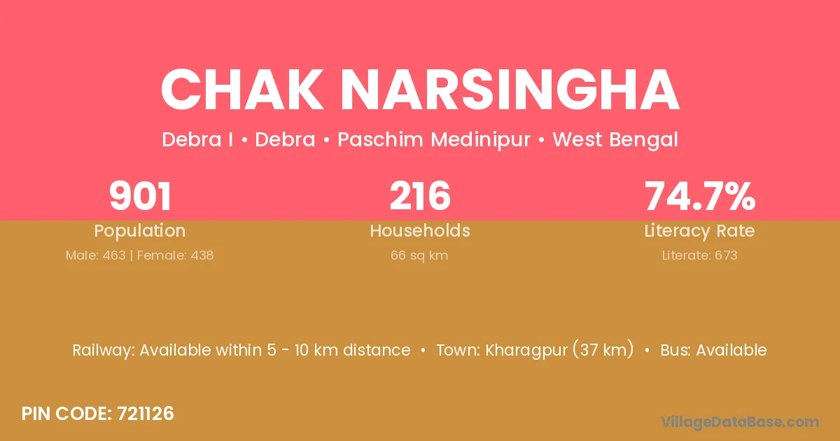 Kharagpur (37 km) is the nearest town to Chak Narsingha village for major economic activities and is located approximately 37 km away.