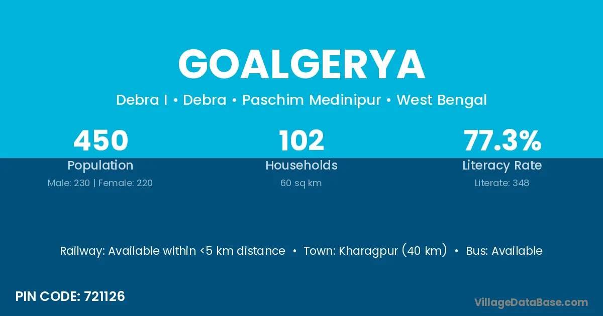 Kharagpur (40 km) is the nearest town to Goalgerya village for major economic activities and is located approximately 40 km away.
