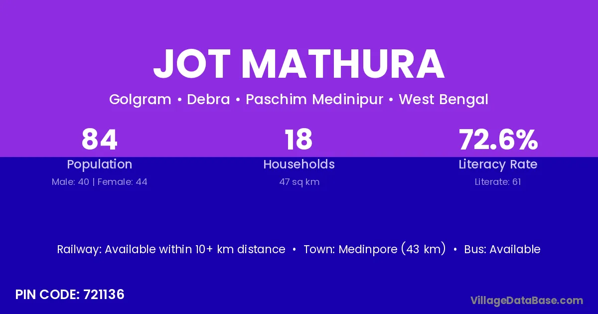 Medinpore (43 km) is the nearest town to Jot Mathura village for major economic activities and is located approximately 43 km away.