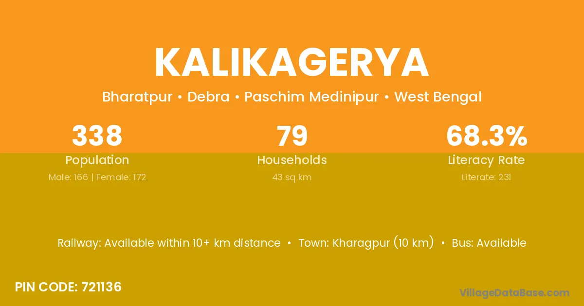 Kharagpur (10 km) is the nearest town to Kalikagerya village for major economic activities and is located approximately 10 km away.