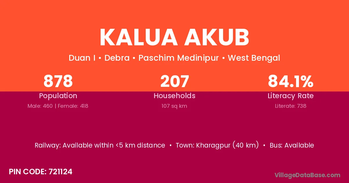 Kharagpur (40 km) is the nearest town to Kalua Akub village for major economic activities and is located approximately 40 km away.