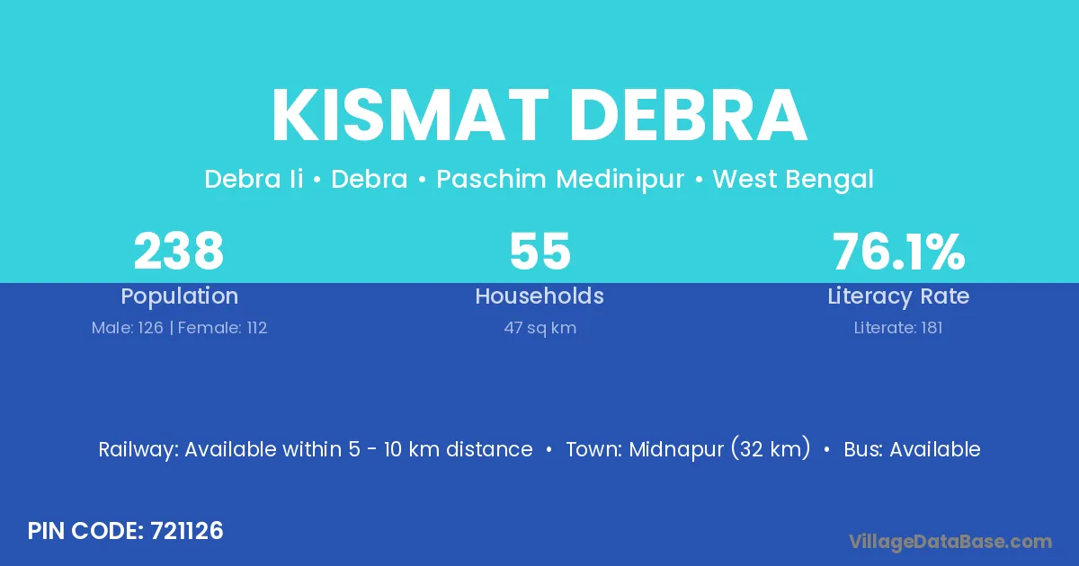 Midnapur (32 km) is the nearest town to Kismat Debra village for major economic activities and is located approximately 32 km away.