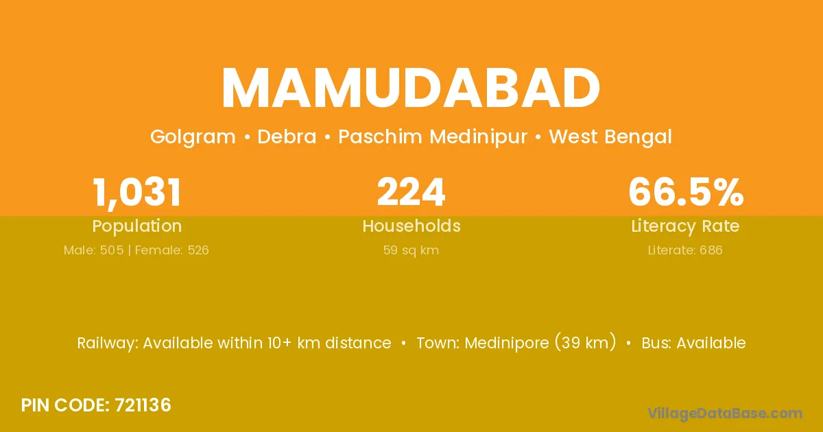 Medinipore (39 km) is the nearest town to Mamudabad village for major economic activities and is located approximately 39 km away.