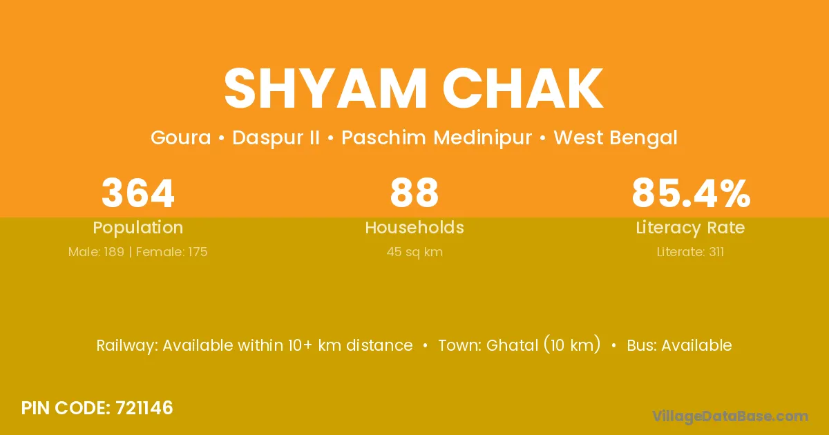 Kharagpur (10 km) is the nearest town to Shyam Chak village for major economic activities and is located approximately 10 km away.
