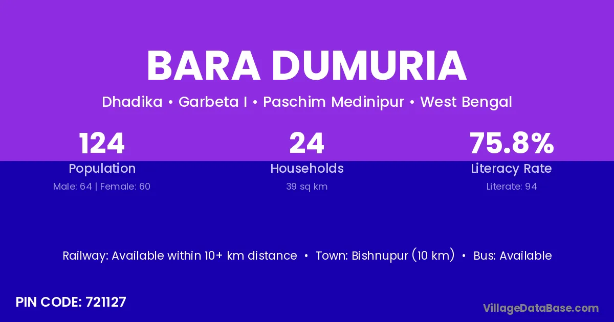 Bishnupur (10 km) is the nearest town to Bara Dumuria village for major economic activities and is located approximately 10 km away.