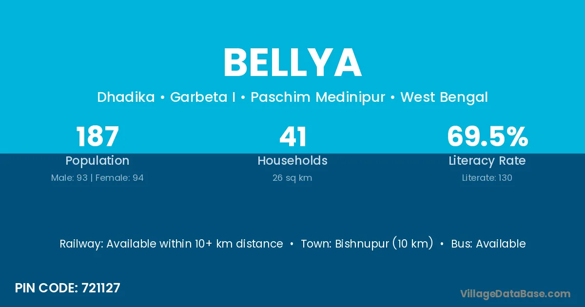 Bishnupur (10 km) is the nearest town to Bellya village for major economic activities and is located approximately 10 km away.