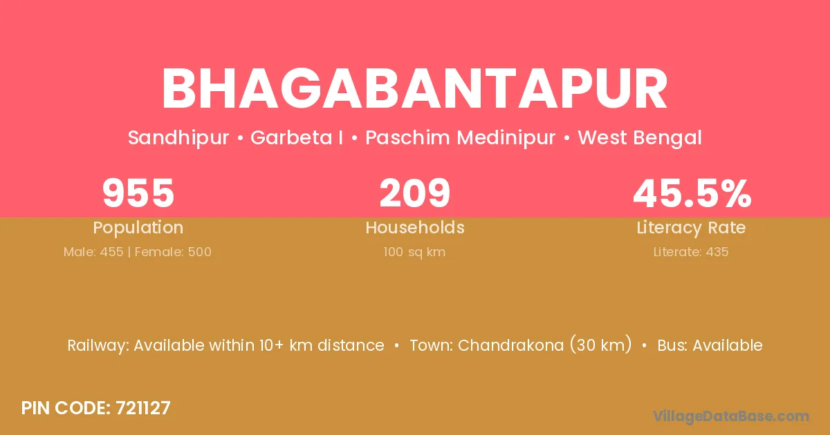 Chandrakona (30 km) is the nearest town to Bhagabantapur village for major economic activities and is located approximately 30 km away.