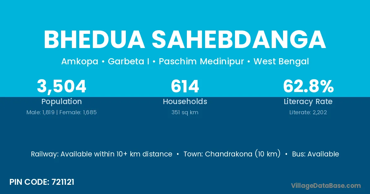 Chandrakona (10 km) is the nearest town to Bhedua Sahebdanga village for major economic activities and is located approximately 10 km away.