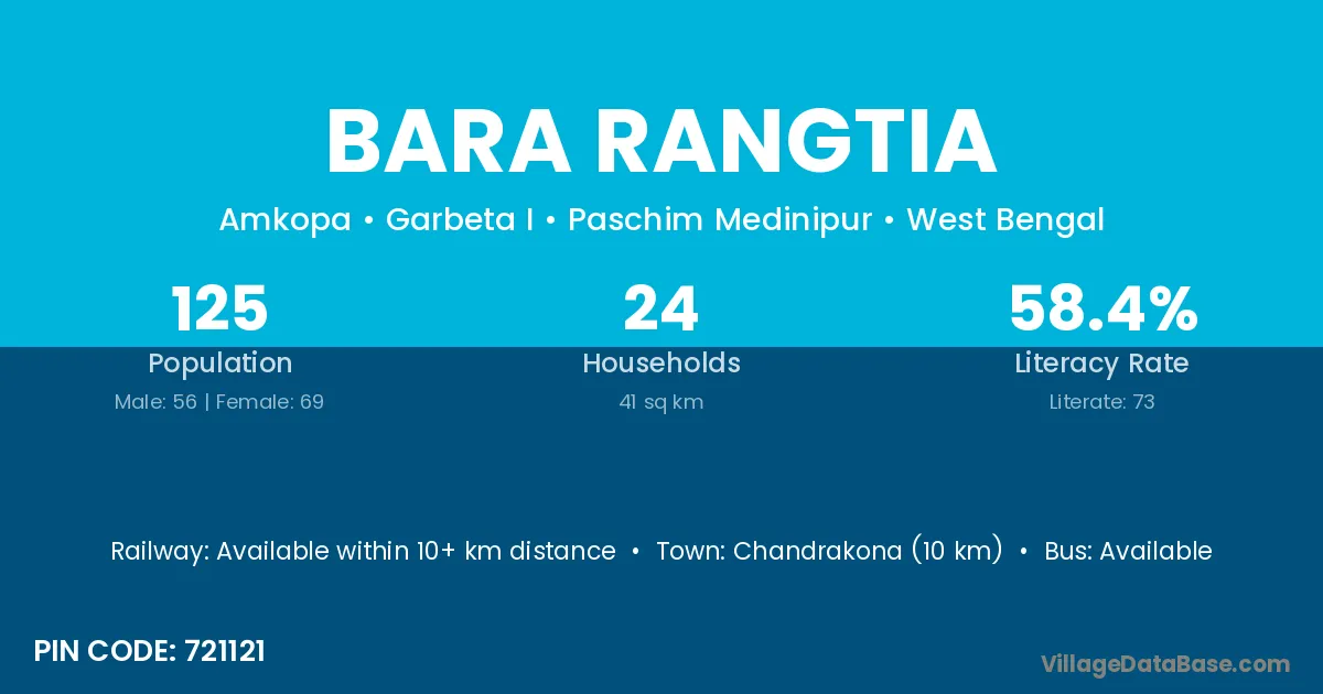 Chandrakona (10 km) is the nearest town to Bara Rangtia village for major economic activities and is located approximately 10 km away.