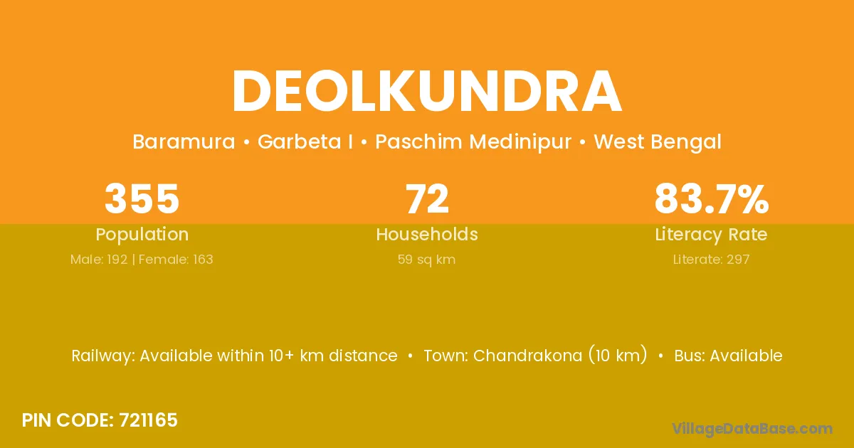 Chandrakona (10 km) is the nearest town to Deolkundra village for major economic activities and is located approximately 10 km away.