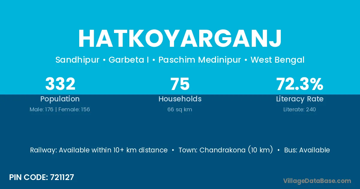 Chandrakona (10 km) is the nearest town to Hatkoyarganj village for major economic activities and is located approximately 10 km away.